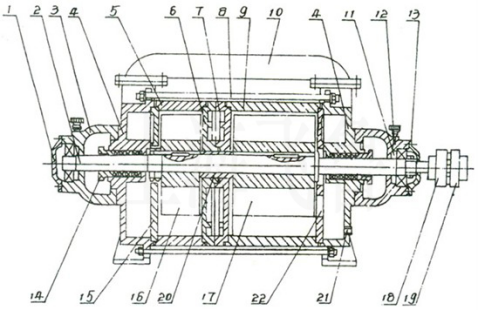 1、后軸承壓蓋 2、軸 3、軸承架 4、前后端蓋 5、短泵體 6、中間壁(B) 7、中間壁(A) 8、拉緊螺栓 9、長泵體 10、連通管 11、調(diào)整墊 12、油杯 13、前軸承壓蓋 14、填料壓蓋 15、后蓋園盤 16、短葉輪 17、長葉輪 18、泵聯(lián)軸器 19、電機(jī)聯(lián)軸器 20、軸套 21、進(jìn)水孔 22、前蓋園盤