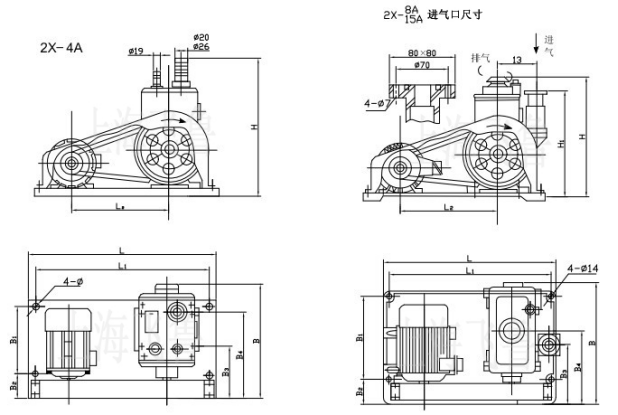 (4)2X型旋片式真空泵型號(hào)表示方法:如2X-4,2代表雙級(jí)泵,X代表旋片式真空泵,一橫線后面的數(shù)字4代表每秒鐘的抽速。