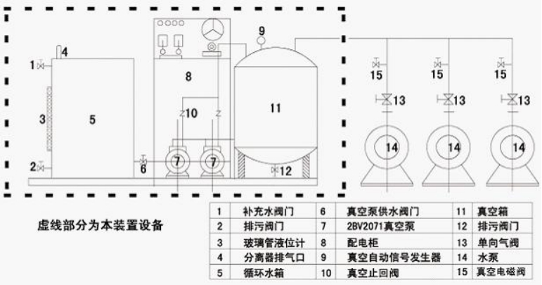 ZKYS真空引水裝置由兩臺2BV7111水環(huán)真空泵,一個真空罐,一個循環(huán)供水罐,一組管道閥件及一套電氣自動控制配電箱組成的成套的真空機組,是以真空罐作為真空存儲設(shè)備的成套系統(tǒng)。泵站內(nèi)所有水泵頂部排氣口均安裝一個單向氣閥(不在本裝置范圍之內(nèi),需要可另行訂貨),并用管道與真空罐相連。單向氣閥的作用是使?jié)B入水泵內(nèi)空氣可自由進(jìn)入真空箱,而水不能通過止回閥。離心泵的開停由中央控制器通過真空管線上各自的電磁閥和流量開關(guān)控制。電磁閥處于常閉狀態(tài),當(dāng)中央控制器需要啟動離心泵時,首先打開電磁閥讓離心泵與真空管線想通,當(dāng)水流過流量開關(guān)時說明離心泵處于可啟動狀態(tài),中央控制器關(guān)閉電磁閥并同時啟動離心泵。真空箱上裝有自動信號發(fā)生器,真空設(shè)備根據(jù)其指令自動工作。當(dāng)真空箱內(nèi)真空度低于下限時,發(fā)出停止指令真空設(shè)備自動停止。因工作液可循環(huán)使用,系統(tǒng)大大減小了工作液的消耗和對環(huán)境的污染,因此在所抽除氣體中有毒,所抽除氣體含有有機溶劑等各種場合具有明顯優(yōu)越性。在本裝置中工作液采用水作為介質(zhì)。